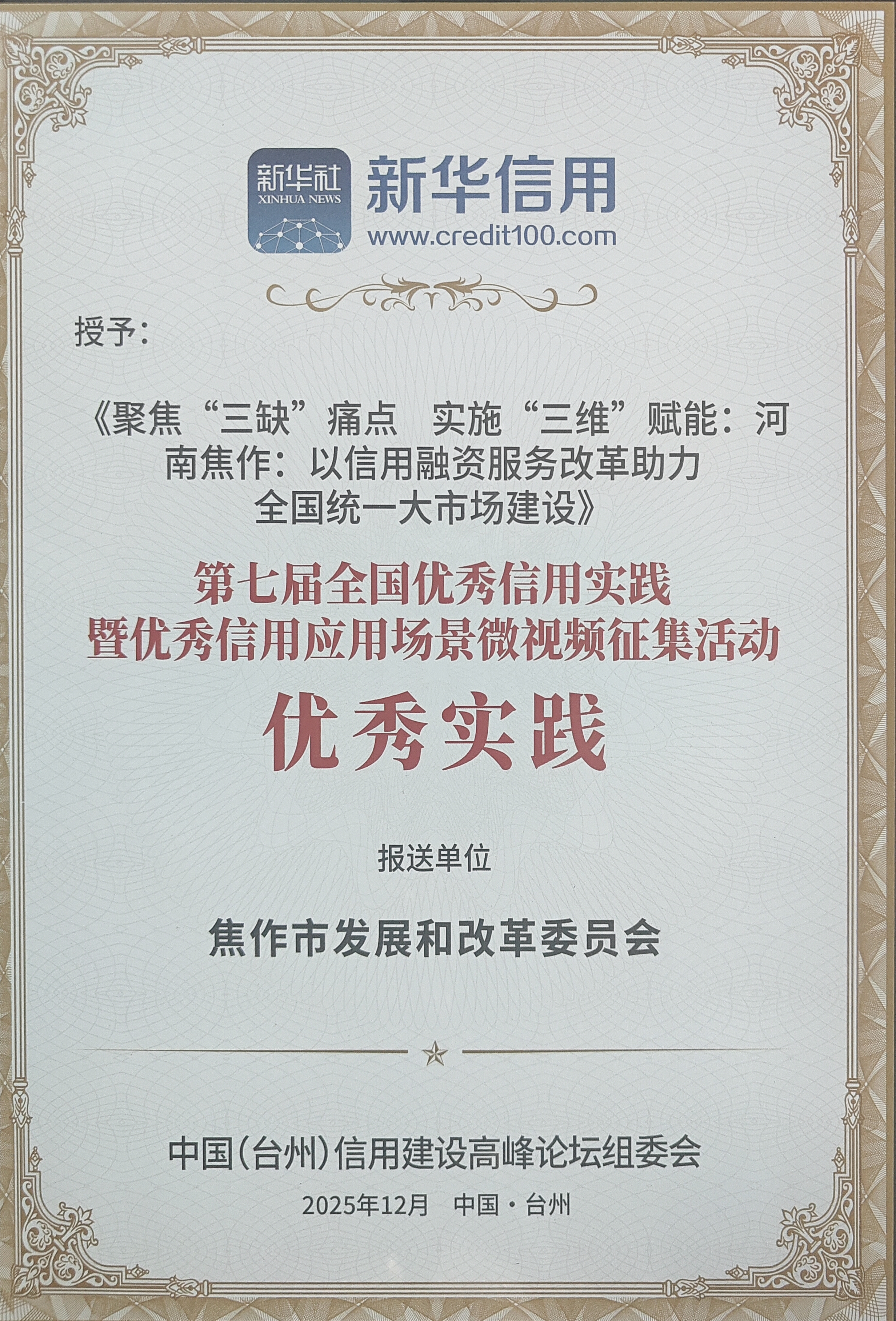 12月12日至14日,由国家发展改革委指导,新华通讯社、台州市人民政府主办的第七届中国城市信用建设高峰论坛在台州市成功举办,公布了全国优秀信用实践暨优秀信用应用场景微视频评选结果,焦作市报送的《聚焦“三缺”痛点 实施“三维”赋能:河南焦作 以信用融资服务改革助力全国统一大市场建设》,成功入选第七届全国信用应用场景优秀实践名单。